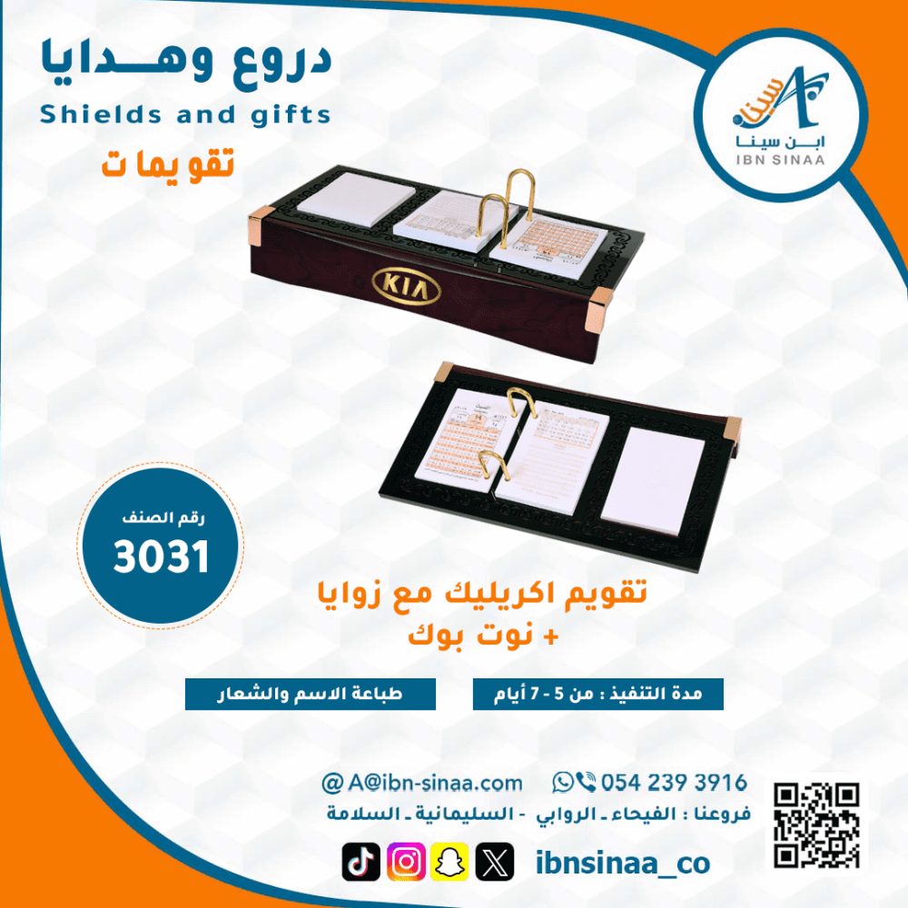 اجعل إدارة وقتك أكثر فعالية وجاذبية مع تقويم أكريليك مع زوايا من متجر مكتبة ابن سينا الإلكتروني. تصميم يجمع بين الوظائف العملية والجمالية لتعزيز إنتاجيتك وتنظيمك.